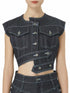 This vest tells a story of resilience—originally adorned with EKG tracings as a tribute to the designer’s daughter’s survival from a near-fatal crash. Though the visual symbols are now absent, the essence of that narrative remains stitched into the design. Featuring asymmetric buttoning and gunmetal hardware, the piece offers a staggered or shoulder-revealing configuration—an elevated reinterpretation of classic denim.