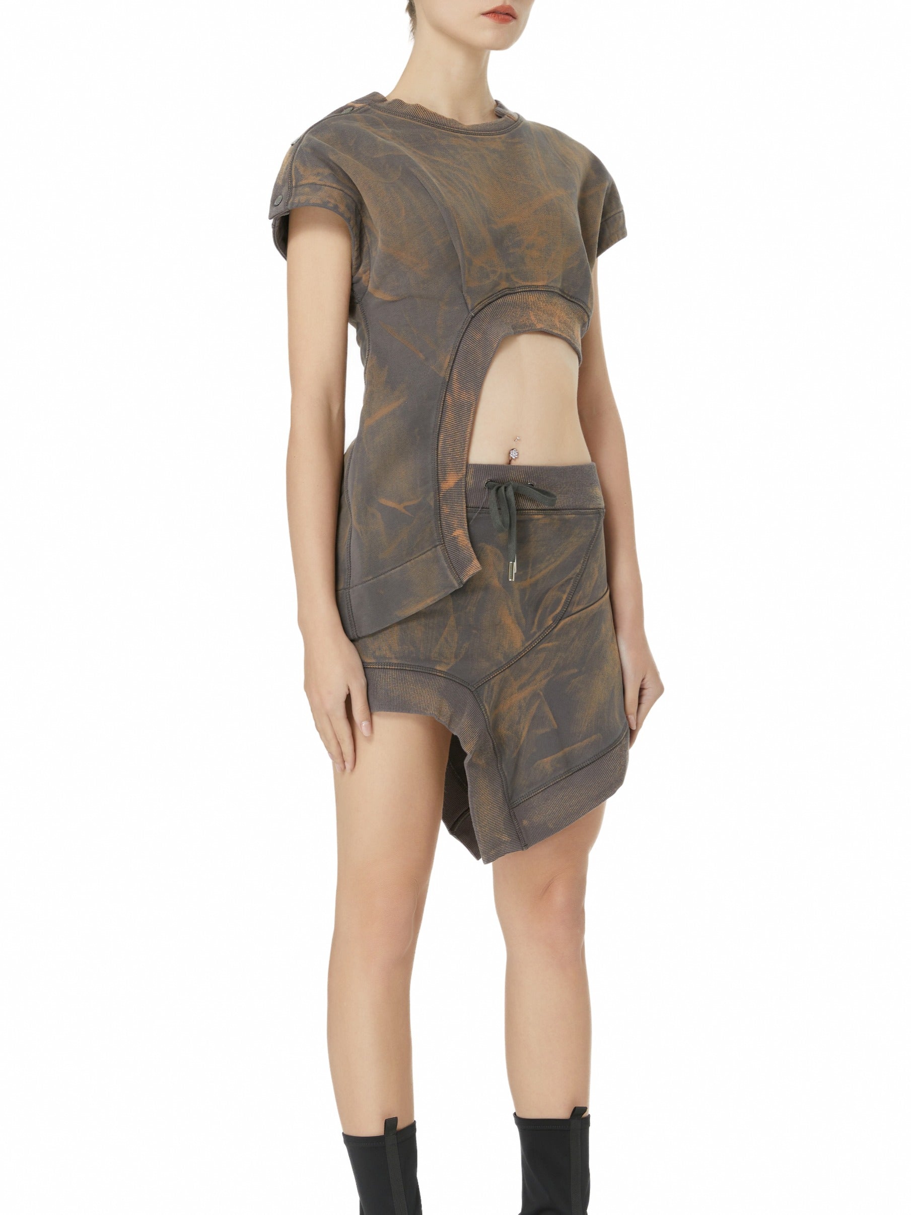 Art is in the details. Lines. Asymmetry. Notched collar. Unique acid wash pattern. The waterfall breaks up the waist line, creating a slimming Gao silhouette.